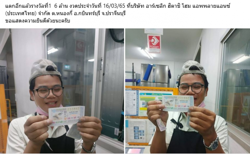 ล่าสุดมีรายงานว่าในโลกออนไลน์ ได้มีการแสดงความยินดีกับหนุ่มโรงงาน ถูกรางวัลที่ 1 โดยระบุว่า รางวัลที่1 6 ล้าน ประจำวันที่ 16/03/65 ที่บริษัท อาร์เซลิก ฮิตาชิ โฮม แอพพลายแอนซ์ (ประเทศไทย) จำกัด ต.หนองกี่ อ.กบินทร์บุรี จ.ปราจีนบุรี ขอแสดงความยินดีด้วยนะครับ