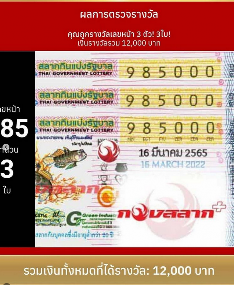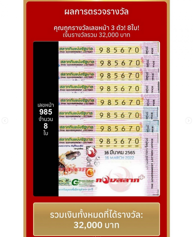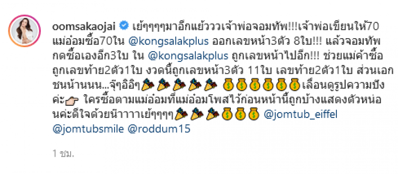 เรียกได้ว่าเป็นอีกหนึ่งดาราที่ถูกรางวัลบ่อยมากสำหรับ อ๋อม สกาวใจ ที่ล่าสุดได้เฮลั่นอีกแล้ว กับผลสลากกินแบ่งรัฐบาล ประจำวันที่ 16 มีนาคม 2565 โดย แม่อ๋อม โพสต์ภาพถูกรางวัลคู่กับลูกชาย ระบุว่า เย้ๆๆๆๆมาอีกแย้วววเจ้าพ่อจอมทัพ เจ้าพ่อเขียนให้70 แม่อ๋อมซื้อ70ใน @kongsalakplus ออกเลขหน้า3ตัว 8ใบ แล้วจอมทัพกดซื้อเองอีก3ใบ ใน @kongsalakplus ถูกเลขหน้าไปอีก ช่วยแม่ค้าซื้อถูกเลขท้าย2ตัว1ใบ ถูกเลขหน้า3ตัว 11ใบ เลขท้าย2ตัว1ใบ ส่วนเอกชนน้านนน...จุ๊ๆอิอิๆ เลื่อนดูรูปความปังค่ะ ใครซื้อตามแม่อ๋อมที่แม่อ๋อมโพสไว้ก่อนหน้านี้ถูกบ้างแสดงตัวหน่อนค่ะดีใจด้วยน๊าาาาเย้ๆๆๆๆ