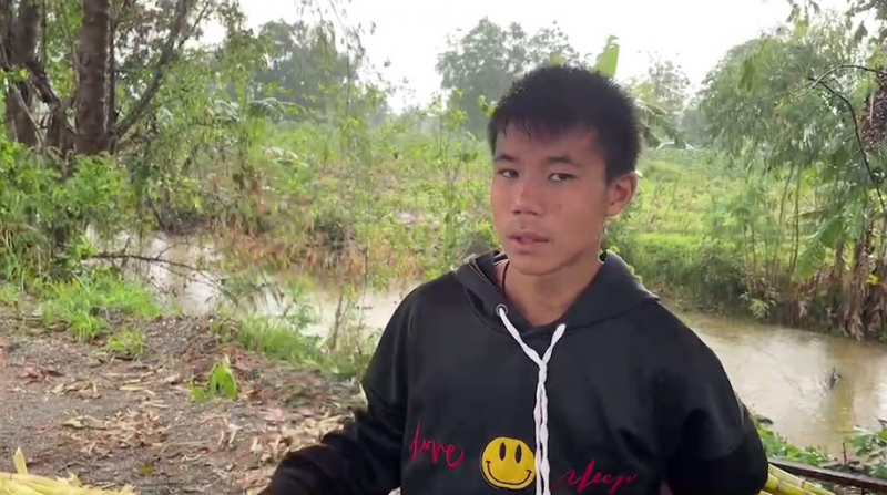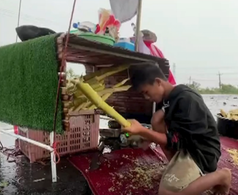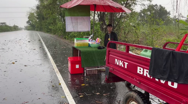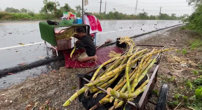 เด็กชายวัย 15 ขวบ พ่อค้าขายน้ำอ้อย ในจ.ชัยภูมิ ร้องตะโกนขายน้ำอ้อยท่ามกลางสายฝนที่ตกลงมาอย่างหนัก เพื่อที่จะหารายได้ใช้จ่ายในการศึกษาและดูแลครอบครัว