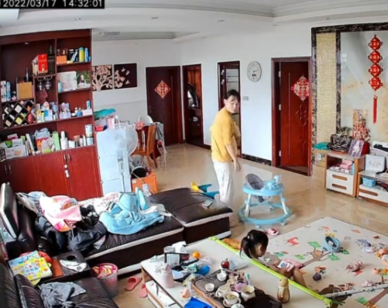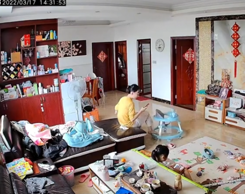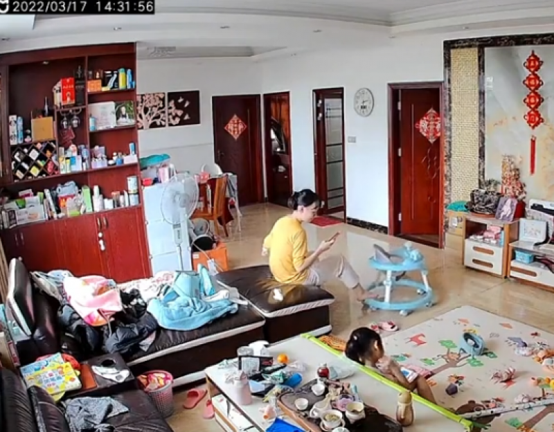 โดยหากดูจากวิดีโอจะเห็นคุณแม่ก้มเล่นโทรศัพท์พร้อมกับใช้เท้าผลักรถเข็นไปเรื่อย ๆ ก่อนจะเงยหน้าขึ้นมามองที่รถเข็น แล้วมีท่าทีร้อนใจและเดินวุ่นไปทั่วทั้งห้อง เพราะนึกว่าลูกน้อยหายไป