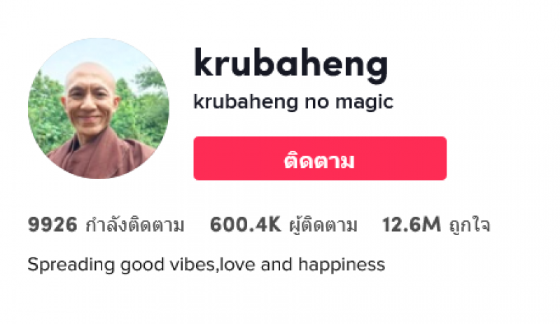 เรียกได้ว่ากลายเป็นอีกหนึ่งคน ที่แจ้งเกิดจากการเล่น Tiktok โดยการทำคอนเทนต์ต่าง ๆ ซึ่งหลายคนคงจะเคยเห็นหรือรู้จักกับช่องของ ครูบาเฮง สำหรับ ครูบาเฮง หรือชื่อช่อง krubaheng มีผู้ติดตามบนติ๊กต็อกสูงกว่า 6 แสนคนแล้ว และมียอดกดถูกใจคลิปทั้งหมดกว่า 12.5 ล้านครั้ง โดยบนโปรไฟล์ได้เขียนข้อความไว้ว่า Spreading good vibes, love and happiness หรือ เผยแพร่สิ่งดี ๆ ความรัก และความสุข