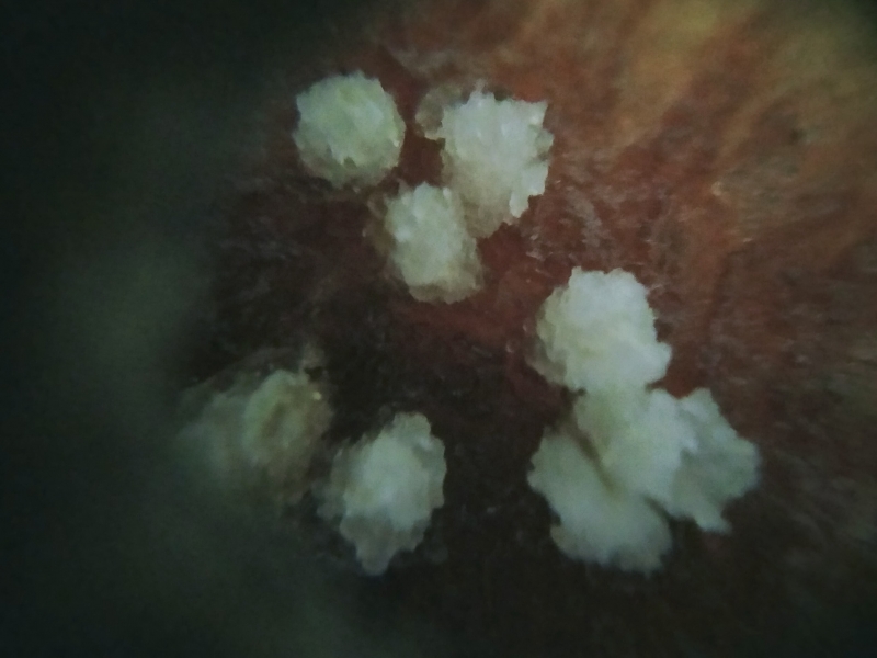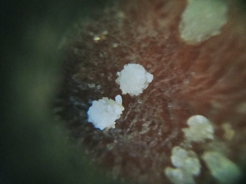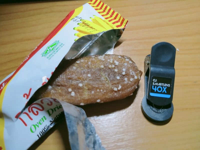 มองด้วยตา เดี๋ยวนี้ก็ตาสั้น เห็นไม่ชัด จะใช้กล้องจากโทรศัพท์มือถือ ก็ขยายภาพได้ไม่ค่อยชัดเท่าไหร่ โชคดีว่า มี CU Smart Lens ชุดเลนส์ขยาย 40 เท่า ของที่จุฬาฯ เคยทำขายเอาไว้ เลยเอามาแปะกับโทรศัพท์ แล้วถ่ายรูปอีกที เห็นชัดเลยทีนี้ก็ไม่ใช่เชื้อรา แต่เป็นผลึกน้ำตาล