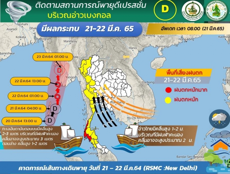 เมื่อเวลา 10.00 น.ของวันนี้ (21 มี.ค. 65) พายุดีเปรสชันบริเวณทะเลอันดามันตอนบนโดยมีศูนย์กลางอยู่ที่ละติจูด 12.0 องศาเหนือ ลองจิจูด 94.0 องศาตะวันออก มีความเร็วลมสูงสุดใกล้ศูนย์กลางประมาณ 55 กิโลเมตร (กม.) / ชั่วโมง (ชม.) พายุนี้กำลังเคลื่อนตัวไปทางทิศเหนือค่อนทางตะวันออกเล็กน้อย ด้วยความเร็วประมาณ 8 กม./ชม. คาดว่าจะเคลื่อนเข้าขึ้นฝั่งบริเวณประเทศเมียนมาในวันพรุ่งนี้ (22 มี.ค. 65)