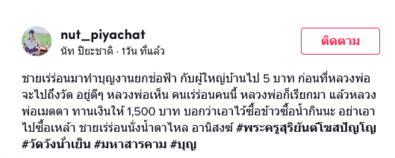 กลายเป็นอีกหนึ่งเรื่องราวสุดประทับใจ ที่มีคนเข้ามาแสดงความคิดเห็นกันเป็นจำนวนมาก หลังจากที่ผู้ใช้ Tiktok ชื่อ nut_piyachat ได้มีการโพสต์คลิป ชายเร่ร่อนคนหนึ่ง มาทำบุญที่วัด โดยระบุว่า ชายเร่ร่อนมาทำบุญงานยกช่อฟ้า กับผู้ใหญ่บ้านไป 5 บาท ก่อนที่หลวงพ่อจะไปถึงวัด อยู่ดีๆ หลวงพ่อเห็น คนเร่ร่อนคนนี้ หลวงพ่อก็เรียกมา แล้วหลวงพ่อเมตตา ทานเงินให้ 1,500 บาท บอกว่าเอาไว้ซื้อข้าวซื้อน้ำกินนะ ชายเร่ร่อนนั่งน้ำตาไหล อานิสงฆ์ #พระครูสุริยันต์โฆสปัญโญ #วัดวังน้ำเย็น #มหาสารคาม