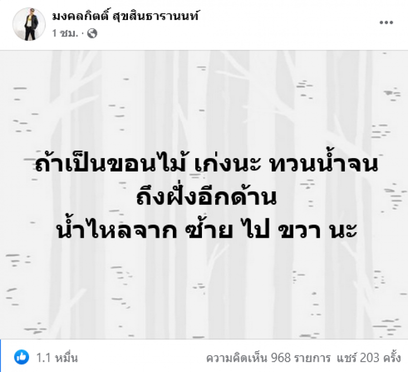 ล่าสุดทางด้าน นายมงคลกิตติ์ สุขสินธารานนท์ ส.ส.บัญชีรายชื่อ หัวหน้าพรรคไทยศรีวิไลย์ ก็ได้ออกมาโพสต์เฟซบุ๊กส่วนตัว ระบุ ว่า ถ้าเป็นขอนไม้ เก่งนะ ทวนน้ำจนถึงฝั่งอีกด้าน น้ำไหลจาก ซ้าย ไป ขวา นะ