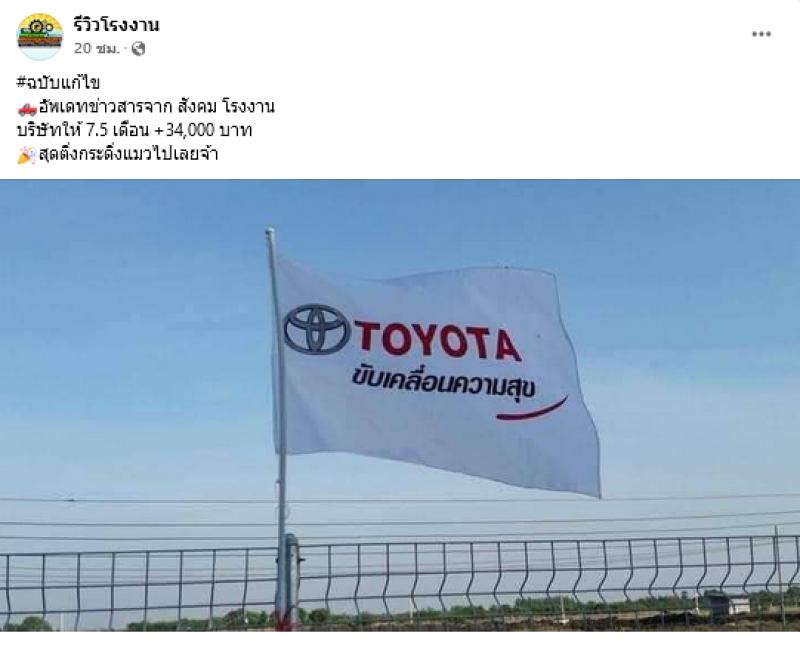 วันที่ 23 มี.ค.2565 มีรายงานว่า ในโลกออนไลน์มีการแชร์ข้อความ ที่เห็นแล้วต้องแอบอิจฉา เบาๆ เมื่อเพจ สังคมโรงงาน V2 ซึ่งมีผู้ติดตามจำนวนมาก โพสต์ข้อความ ระบุ บริษัทแห่งหนึ่งซึ่งทำงานให้บริษัท โตโยต้า มอเตอร์ (ประเทศไทย) ประกาศให้รางวัลพนักงานที่ทุมเททำงานให้บริษัทด้วยการ ประกาศให้โบนัส 7.5 เดือน+34,000 ครบรอบ 60 ปี+16,000
