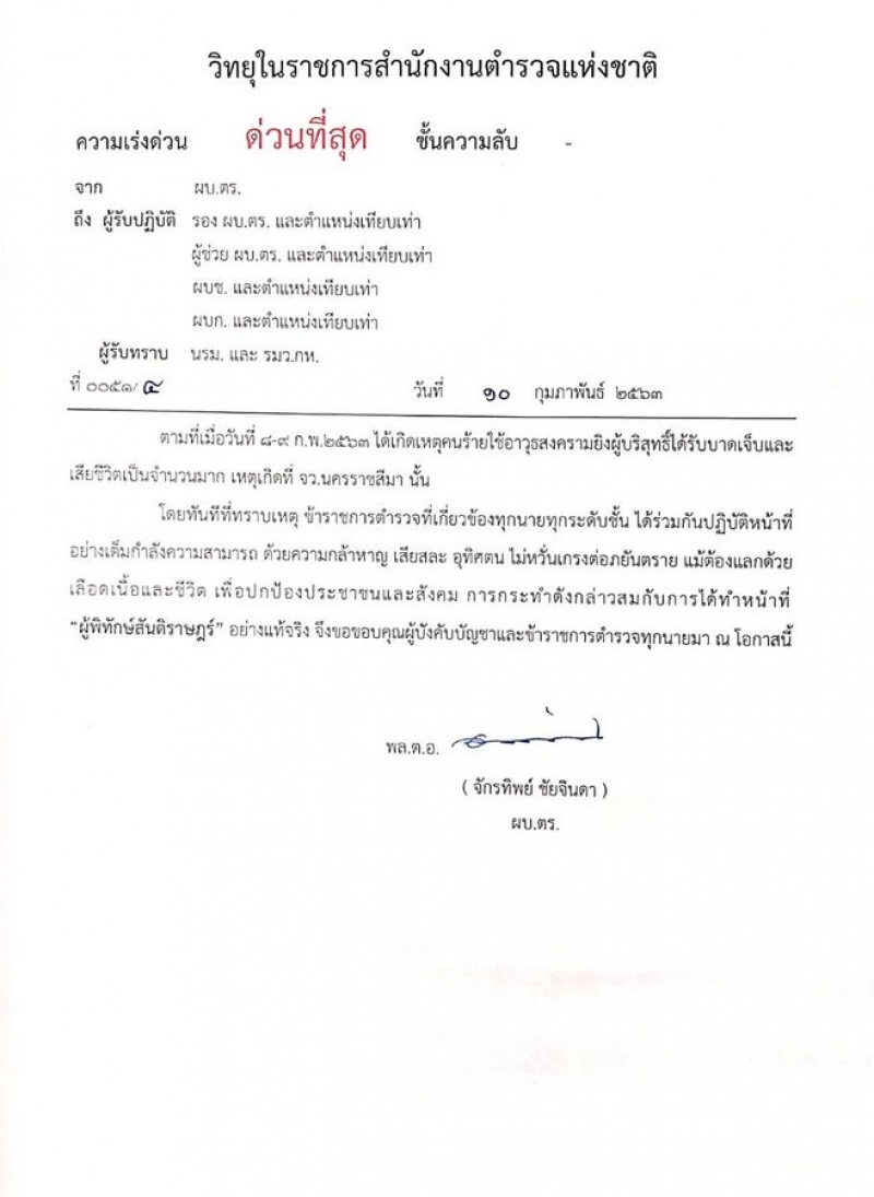 เมื่อวันที่ 10 กุมภาพันธ์ 2563 ที่สำนักงานตำรวจแห่งชาติ (ตร.) พล.ต.อ.จักรทิพย์ ชัยจินดา ผู้บัญชาการตำรวจแห่งชาติ (ผบ.ตร.) มีหนังสือวิทยุในราชการ ตร. ด่วนที่สุด ที่ 0051/4 ลงวันที่ 10 ก.พ. ถึง รอง ผบ.ตร. ผู้ช่วย ผบ.ตร. ผบช. ผบก. และตำแหน่งเทียบเท่า ใจความว่า