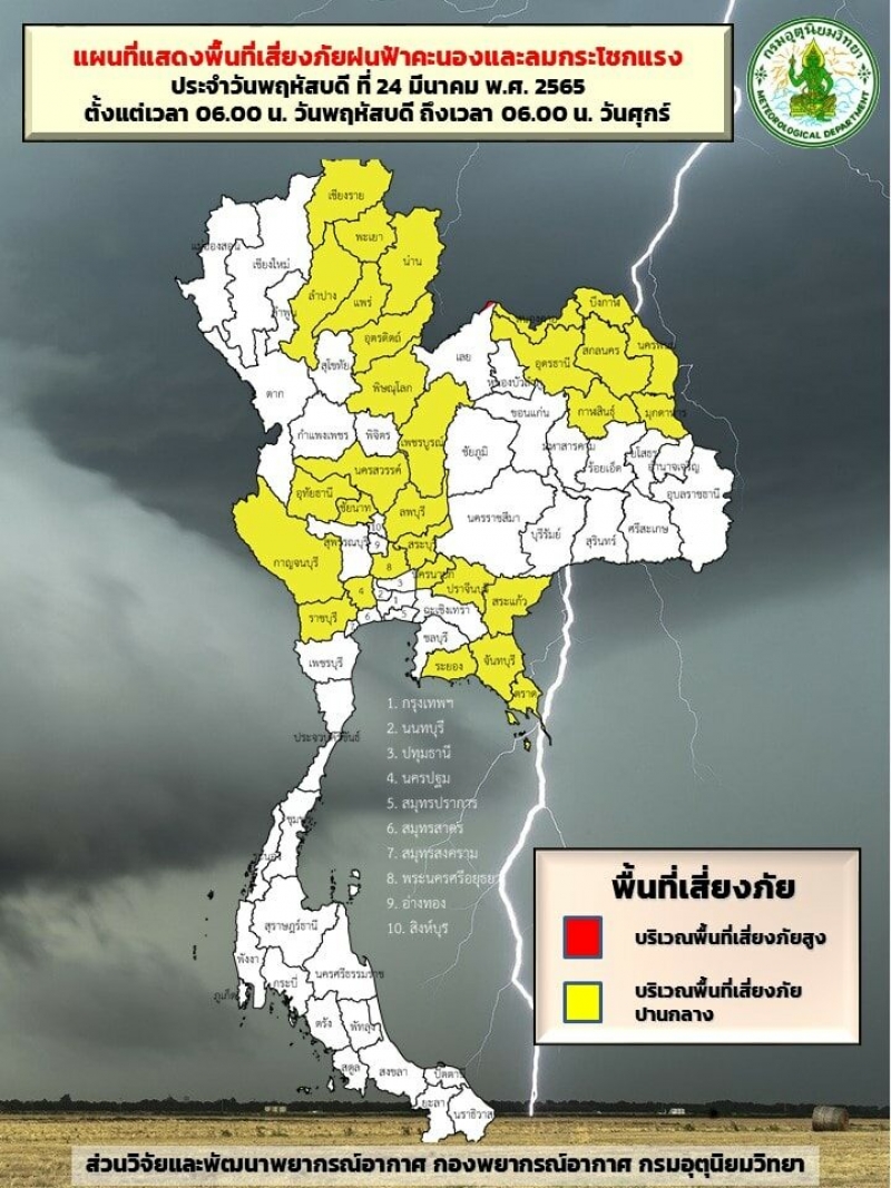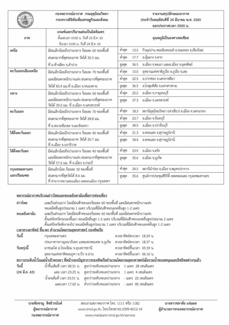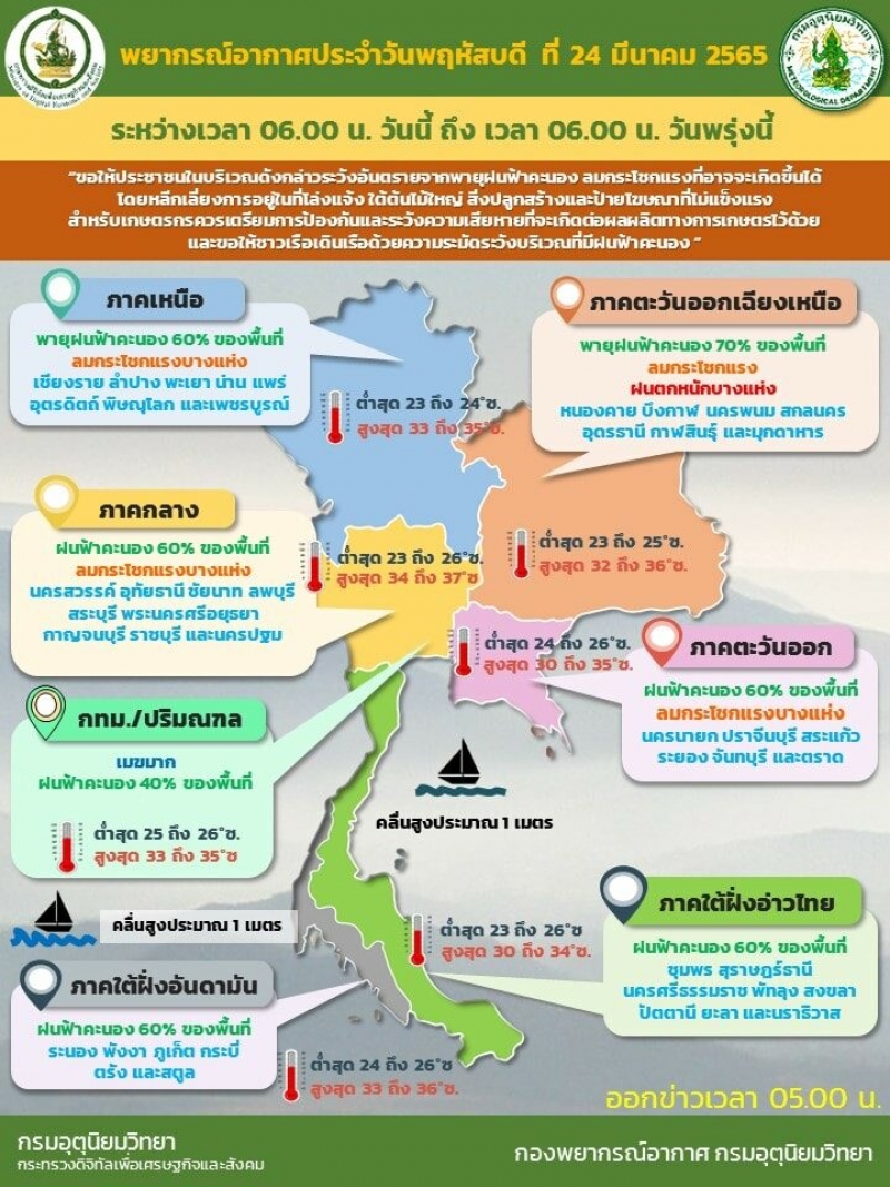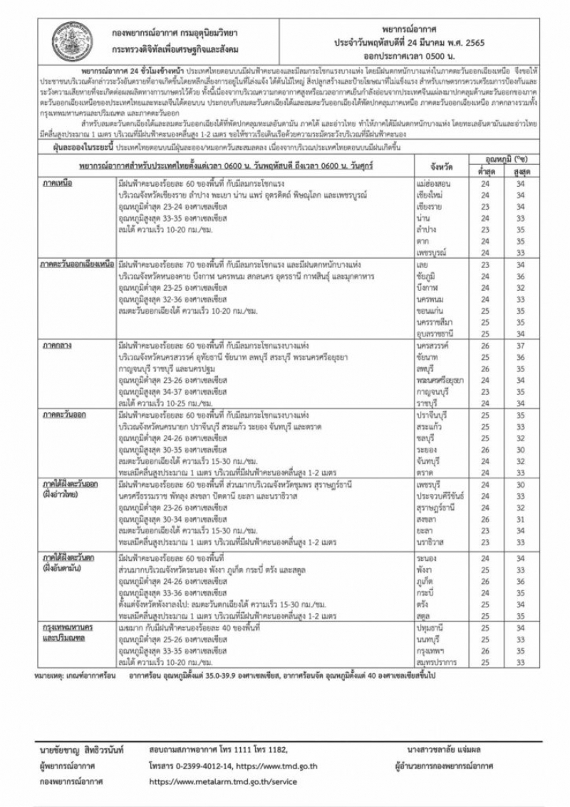 เมื่อวันที่ 24 มีนาคม กรมอุตุฯ เผยแพร่พยากรณ์อากาศ 24 ชั่วโมงข้างหน้า ประเทศไทยตอนบนมีฝนฟ้าคะนองและมีลมกระโชกแรงบางแห่ง โดยมีฝนตกหนักบางแห่งในภาคตะวันออกเฉียงเหนือ จึงขอให้ประชาชนบริเวณดังกล่าวระวังอันตรายที่อาจเกิดขึ้นโดยหลีกเลี่ยงการอยู่ในที่โล่งแจ้ง ใต้ต้นไม้ใหญ่ สิ่งปลูกสร้างและป้ายโฆษณาที่ไม่แข็งแรง สำหรับเกษตรกรควรเตรียมการป้องกันและระวังความเสียหายที่จะเกิดต่อผลผลิตทางการเกษตรไว้ด้วย
