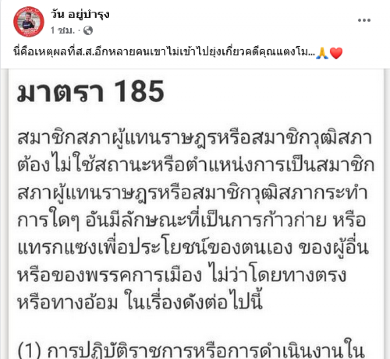 ล่าสุดมีรายงานว่า ทางด้าน วัน อยู่บำรุง ได้ออกมาโพสต์ข้อควา ถึงเหตุผลที่ ส.ส. อีกหลายคน เขาไม่เข้าไปยุ่งเกี่ยวกับคดีคุณแตงโม โดยได้มีการโพสต์ลงในเฟซบุ๊ก วัน อยู่บำรุง ระบุว่า