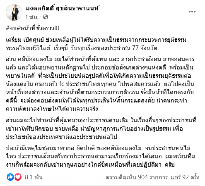 วันที่ 24 มี.ค. 65 ภายหลังจากที่ นายมงคลกิตติ์ สุขสินธารานนท์ ส.ส.พรรคไทยศรีวิไลย์ ได้ประกาศผ่านเฟซบุ๊กส่วนตัว ขอจบหน้าที่คดีแตงโมชั่วคราว ให้เป็นหน้าที่ตำรวจดำเนินการตามกระบวนการยุติธรรม