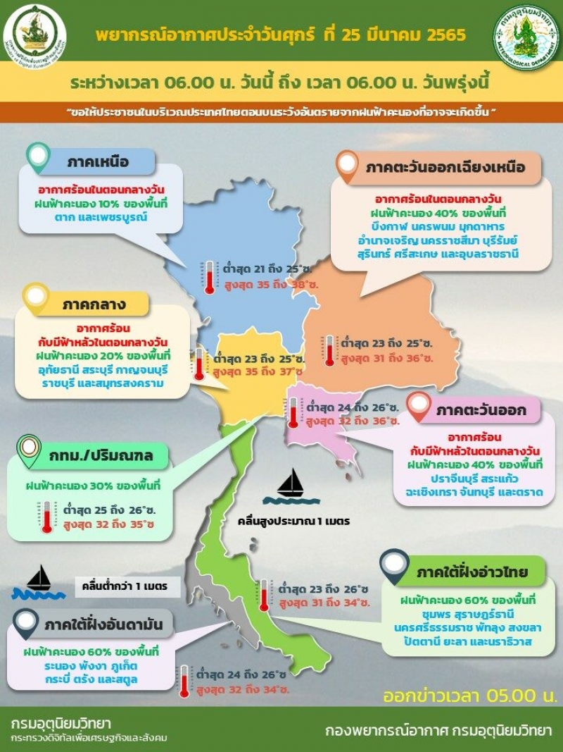 วันที่ 25 มี.ค.65 กรมอุตุฯ พยากรณ์อากาศ 24 ชั่วโมงข้างหน้า หย่อมความกดอากาศต่ำเนื่องจากความร้อนปกคลุมภาคเหนือตอนบน ทำให้ประเทศไทยตอนบนมีอุณหภูมิสูงขึ้น โดยมีอากาศร้อนกับมีฟ้าหลัวในตอนกลางวันประกอบกับลมใต้และลมตะวันออกเฉียงใต้ที่พัดปกคลุมภาคเหนือตอนล่าง ภาคตะวันออกเฉียงเหนือ ภาคกลาง รวมทั้งกรุงเทพมหานครและปริมณฑล และภาคตะวันออกมีกำลังอ่อนลง ทำให้ประเทศไทยตอนบนมีฝนลดลง