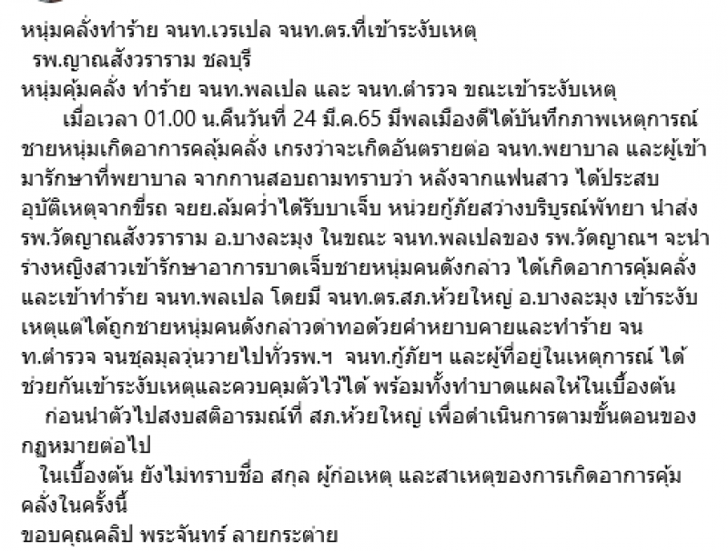 เรียกได้ว่าเป็นอีกหนึ่งเรื่องราว ที่ถูกวิพากษ์วิจารณ์ในโลกออนไลน์ หลังจากที่ทางเฟซบุ๊กเพจ อยากดังเดี๋ยวจัดให้ รีเทิร์น part 2 ได้มีการโพสต์คลิป ขณะที่ชายหนุ่มคนหนึ่งโวยวายเจ้าหน้าที่ในโรงพยาบาลกับเจ้าหน้าที่ตำรวจ จนกลายเป็นเหตุบานปลายทำให้มีการตอบโต้กันเกิดขึ้น เหตุการณ์นี้เกิดขึ้นที่โรงพยาบาลญาณสังวราราม จ.ชลบุรี เมื่อเวลา 01:00 น.คืนวันที่ 24 มี.ค.65 ที่ผ่านมา โดยมีพลเมืองดีทำการบันทึกวิดีโอภาพเหตุการณ์ทั้งหมดเอาไว้ได้