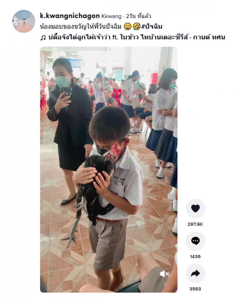 เรียกได้ว่ากลายเป็นอีกหนึ่งเรื่องราว ที่สร้างความฮือฮาในโลกออนไลน์ ภายหลังจากที่ผู้ใช้ TikTok ชื่อว่า k.kwangnichagon ได้มีการเผยคลิปเห็นเหตุการณ์ในช่วงวันปัจฉิมของนักเรียนชั้น ป.6 โรงเรียนอนุบาลวัดหนองเต่า ในจังหวัดอุทัยธานี โดยมีเด็กนักเรียนชั้น ป.4 ชื่อว่าน้องไนท์ นำ ไก่ชน จริงๆ มามอบให้กับ พี่เต็ง เด็กนักเรียนชั้น ป.6 ที่กำลังจะจบการศึกษาเพื่อเป็นของขวัญ
