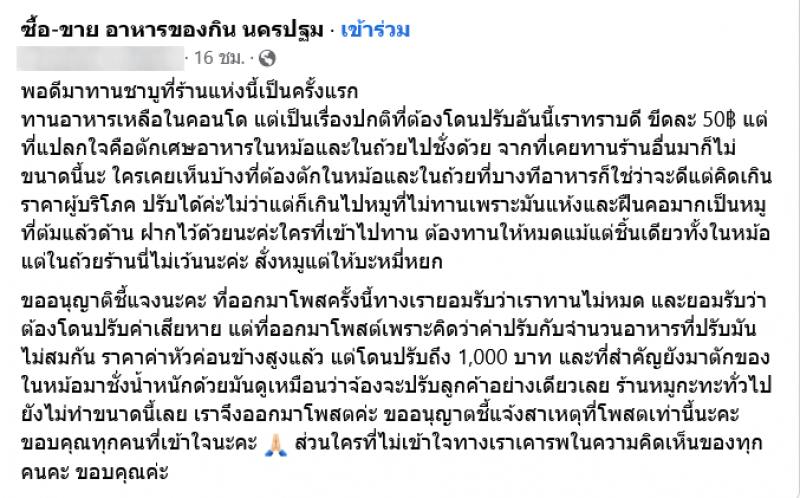ขออนุญาติชี้แจงนะคะ ที่ออกมาโพสครั้งนี้ทางเรายอมรับว่าเราทานไม่หมด และยอมรับว่าต้องโดนปรับค่าเสียหาย แต่ที่ออกมาโพสต์เพราะคิดว่าค่าปรับกับจำนวนอาหารที่ปรับมันไม่สมกัน ราคาค่าหัวค่อนข้างสูงแล้ว แต่โดนปรับถึง 1,000 บาท และที่สำคัญยังมาตักของในหม้อมาชั่งน้ำหนักด้วยมันดูเหมือนว่าจ้องจะปรับลูกค้าอย่างเดียวเลย ร้านหมูกะทะทั่วไปยังไม่ทำขนาดนี้เลย เราจึงออกมาโพสตค่ะ ขออนุญาตชี้แจ้งสาเหตุที่โพสตเท่านี้นะคะ ขอบคุณทุกคนที่เข้าใจนะคะ ส่วนใครที่ไม่เข้าใจทางเราเคารพในความคิดเห็นของทุกคนคะ ขอบคุณค่ะ
