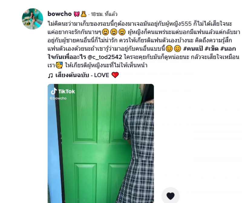 เรียกได้ว่าเป็นอีกหนึ่งเรื่องราวที่ชาวโซเชียลต่างเข้ามาแสดงความคิดเห็นกันเป็นจำนวนมาก หลังสาวรายหนึ่งได้โพสต์คลิปว่าตนเองนั้นได้เลิกกับแฟน หลังจับได้ว่าเขามีผู้หญิงอีกคน ซึ่งวันนี้ตั้งใจจะมาเก็บข้าวของออก