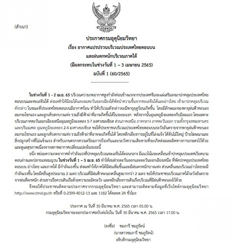 เมื่อเวลา 05.00 น. วันที่ 30 มี.ค.2565 กรมอุตุนิยมวิทยา เผยแพร่ประกาศ อากาศแปรปรวนบริเวณประเทศไทยตอนบนและฝนตกหนักบริเวณภาคใต้ (มีผลกระทบในช่วงวันที่ 1-3 เมษายน 2565) ฉบับที่ 1 ระบุว่า ในช่วงวันที่ 1-2 เม.ย.65 บริเวณความกดอากาศสูงกำลังค่อนข้างแรงจากประเทศจีนจะแผ่เสริมลงมาปกคลุมประเทศไทยตอนบนและทะเลจีนใต้ ส่งผลทำให้มีลมใต้และลมตะวันออกเฉียงใต้พัดนำความชื้นจากทะเลจีนใต้และอ่าวไทย เข้ามาปกคลุมบริเวณดังกล่าว