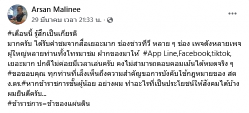 ล่าสุดมีรายงานว่าพบเฟซบุ๊กของตำรวจนายนี้แล้ว โดยในเฟซบุ๊กของตำรวจหนุ่มท่านนี้ ก็ได้มีการออกมาโพสต์ขอบคุณ โดยระบุว่า #เดือนนี้ รู้สึกเป็นเกียรติ มากครับ ได้รับคำชมจากสื่อเยอะมาก ช่องข่าวทีวี หลาย ๆ ช่อง เพจดังหลายเพจ ผู้ใหญ่หลายท่านทั้งโทรมาชม ฝากของมาให้ #App Line,Facebook,tiktok, เยอะมาก ปกติไม่ค่อยมีเวลาเล่นครับ คงไม่สามารถตอบคอมเม้นได้หมดจริง ๆ #ขอขอบคุณ ทุกท่านที่เล็งเห็นถึงความสำคัญขอการบังคับใช้กฎหมายของ สตง.ตร.#่หากข้าราชการชั้นผู้น้อย อย่างผม ทำอะไรที่เป็นประโยชน์ให้สังคมได้บ้าง ผมยินดีครับ... #ข้าราชการ=ข้าของแผ่นดิน