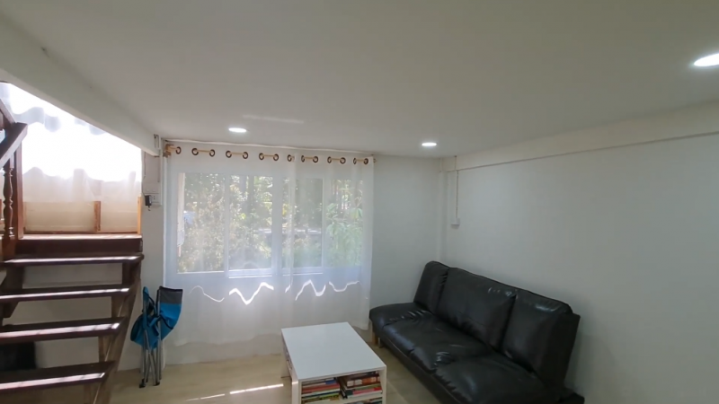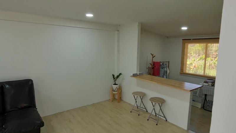 เมื่อเข้าไปข้างในชั้นล่าง ได้จัดสรรใหม่ออกมาเป็นห้องรับแขก ปูพื้นกระเบื้องยาง ติดฝ้า ใส่ผ้าม่านเข้าไป ออกมาเป็นมุมพักผ่อนน่ารักดูดี พร้อมกับที่มีการนำกำแพงเก่าออกส่วนหนึ่งเพื่อขยายพื้นที่ ทำเป็นมินิบาร์เล็ก ๆ และใกล้ ๆ กันก็ทำห้องน้ำใหม่ ปูกระเบื้องและทำชักโครก-ฝักบัวสวย ๆ ออกมาหรูเลยทีเดียว