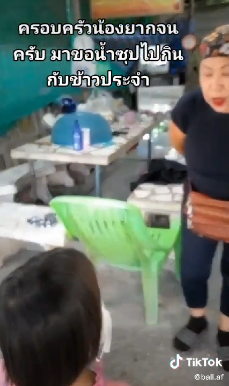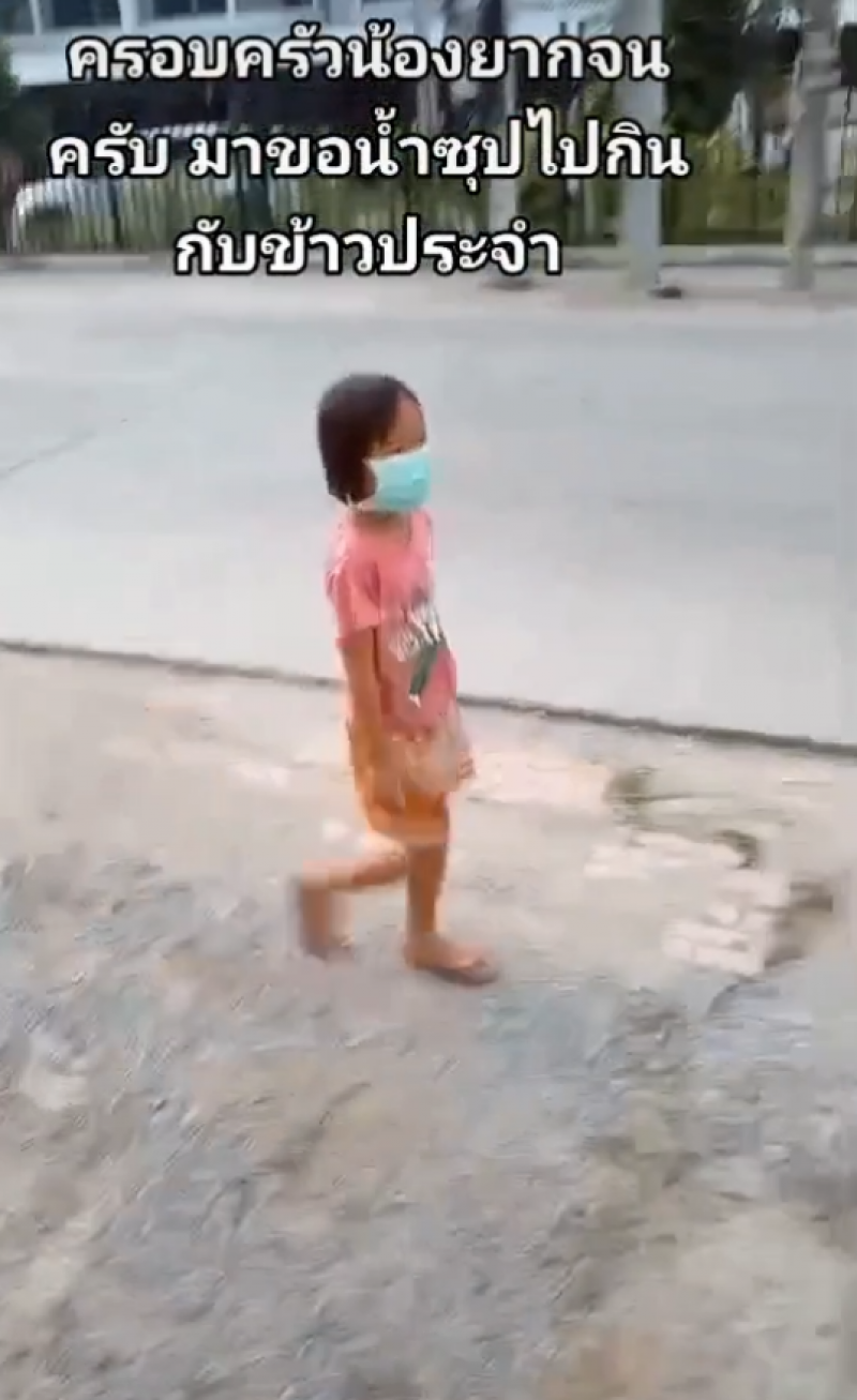 เป็นอีกหนึ่งเรื่องราว ที่หลายคนเห็นแล้ว ต่างก็รู้สึกสงสาร ผู้ใช้ tiktok ชื่อ BallAF ได้โพสต์เรื่องราวของเด็กหญิงวัย 6 ขวบ พร้อมข้อความว่า วันนี้เห็นน้องเดินมาเลยถ่ายคลิปไว้ พร้อมกับคลิปวีดีโอ ขณะที่เด็กหญิงเดินมาและมีการพูดคุยและสอบถามว่ามาทำอะไร เด็กหญิงกล่าวว่ามาขอน้ำซุปเอาไปกินกับข้าว เอาไปกินกัน 5 คนกับน้องและแม่ที่รออยู่บ้าน จากนั้นก็มีการให้นั่งรอแล้วเจ้าของร้านก็ได้ทำให้