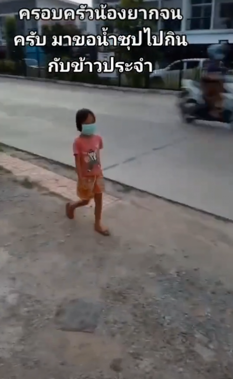 ทั้งนี้ มีรายงานว่า เด็กหญิงต้องเดินไปขอน้ำซุปมาเพื่อกินกับข้าวทุกวัน เอามากินกับพ่อแม่แล้วก็น้องรวม 5 คน พ่อของน้องทำงานก่อสร้าง มีรายได้วันละประมาณ 500 บาท แต่ก็ไม่มีงานทุกวัน ช่วงที่ผ่านมาก็ไม่มีรายได้อะไรเลย ตอนนี้ก็มีบ้างไม่มีบ้าง ต้องไปขออาศัยให้ลูกไปขอน้ำซุปเอามาคลุกข้าวกิน
