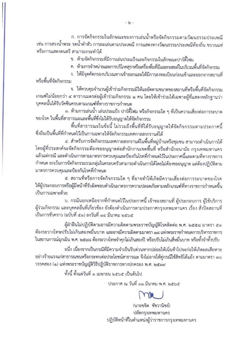 เมื่อวันที่ 31 มีนาคม นายขจิต ชัชวานิชย์ ปลัดกรุงเทพมหานคร ปฏิบัติหน้าที่ในตำแหน่งผู้ว่าฯกทม. ลงนามออกประกาศ กทม. เรื่อง กำหนดสถานที่ กิจการ หรือกิจกรรม ที่สามารถดำเนินการได้เป็นกรณีเฉพาะ เพื่อการจัดกิจกรรมเทศการสงกรานต์ ประจำปี พ.ศ.2565 ระหว่างวันที่ 10-15 เม.ย.65