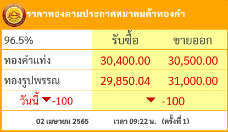 วันที่ 1 เมษายน 2565 สมาคมค้าทองคำรายงาน ราคาทองไทย ครั้งที่ 1 เมื่อเวลา 09:22 น. โดยราคาทองล่าสุดราคานั้น ได้มีการปรับลดลงมาอีก 100 บาท ในวันนี้ ส่งผลทำให้ราคาวันนี้ทองคำแท่ง รับซื้อบาทละ 30,400 ขายออกบาทละ 30,500 บาท ส่วนทองรูปพรรณ รับซื้อบาทละ 29,850.04 ขายออกบาทละ 31,000 บาท