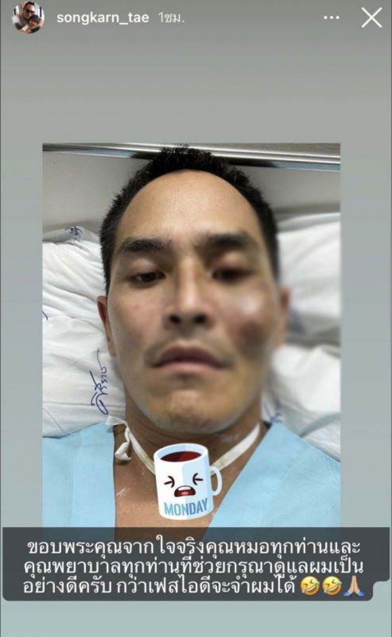 ทั้งนี้ ในสตอรี่ล่าสุดของหนุ่มสงกรานต์ยังได้อัปเดตอีกว่า ขอบพระคุณจากใจจริงคุณหมอทุกท่านและคุณพยาบาลทุกท่านที่ช่วยกรุณาดูแลผมเป็นอย่างดีครับ กว่าเฟสไอดีจะจำผมได้ ซึ่งมีรายงานว่าเกิดเหตุไม่คาดคิด ขณะที่ดำลังปั่นจักรยาน แต่อย่างไรก็ตาม เจ้าตัวก็ยังไม่ได้ชี้แจงรายละเอียด ถึงเหตุการณ์ที่เกิดขึ้นกับเจ้าตัว คงต้องรอให้หายดีก่อน