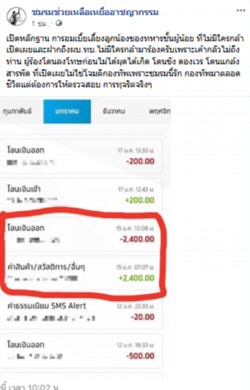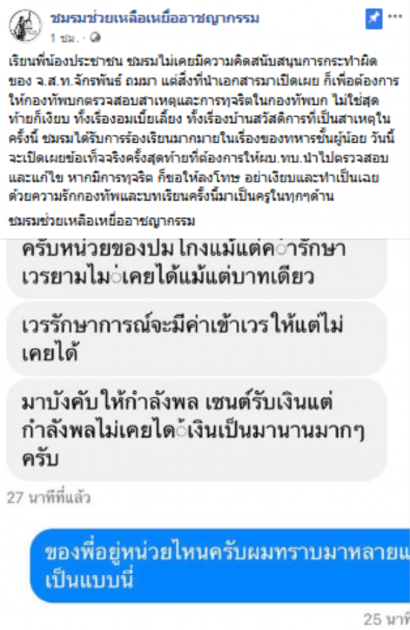 ล่าสุดเจ้าตัวได้ออกมาโพสต์หลักฐานเด็ด โดยได้ระบุข้อความว่า เปิดหลักฐาน การอมเบี้ยเลี้ยงลูกน้องของทหารชั้นผู้น้อย ที่ไม่มีใครกล้าเปิดเผยและฝากถึงผบ ทบ ไม่มีใครกล้ามาร้องครับเพราะเค้ากลัวไม่ถึงท่าน ผู้ร้องโดนลงโทษก่อนไม่ได้ผุดได้เกิด โดนแกล้งสารพัด ที่เปิดเผยไม่ใช่ว่ากองทัพเพราะชมรมนี้รัก กองทัพมาตลอดชีวิตแต่ต้องการให้ตรวจสอบ การทุจริตจริงๆ