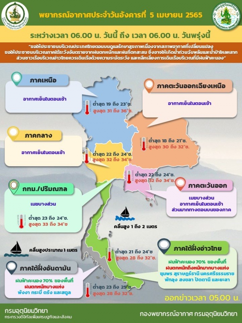 วันที่ 5 เม.ย.65 กรมอุตุฯ รายงาน พยากรณ์อากาศ 24 ชั่วโมงข้างหน้า พบว่า ลมตะวันออกและลมตะวันออกเฉียงเหนือที่พัดปกคลุมอ่าวไทยและภาคใต้มีกำลังปานกลาง ทำให้ภาคใต้มีฝนตกหนักถึงหนักมากบางแห่ง ขอให้ประชาชนบริเวณภาคใต้ระวังฝนตกหนักและฝนที่ตกสะสม ซึ่งอาจให้เกิดน้ำท่วมฉับพลันและน้ำป่าไหลหลาก