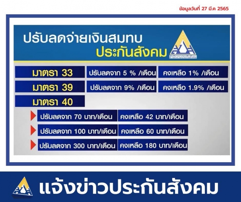 โดยในวันนี้ (5 เมษายน 2565) คณะรัฐมนตรีได้มีมติเห็นชอบมาตรการในการช่วยเหลือลดเงินสมทบนายจ้าง ผู้ประกันตนมาตรา 33 จากเดิมร้อยละ 5 เหลือฝ่ายละร้อยละ 1 ของค่าจ้าง และผู้ประกันตนตามมาตรา 39 ปรับลดอัตราเงินสมทบ จากเดิมร้อยละ 9 (เดือนละ 432 บาท) เหลือร้อยละ 1.9 คิดเป็นเงินเดือนละ 91 บาท โดยเริ่มตั้งแต่งวดเดือนพฤษภาคม - กรกฎาคม 2565 สำหรับฝ่ายรัฐบาลยังส่งเงินสมทบในอัตราเดิมคือร้อยละ 2.75 ของค่าจ้างผู้ประกันตน