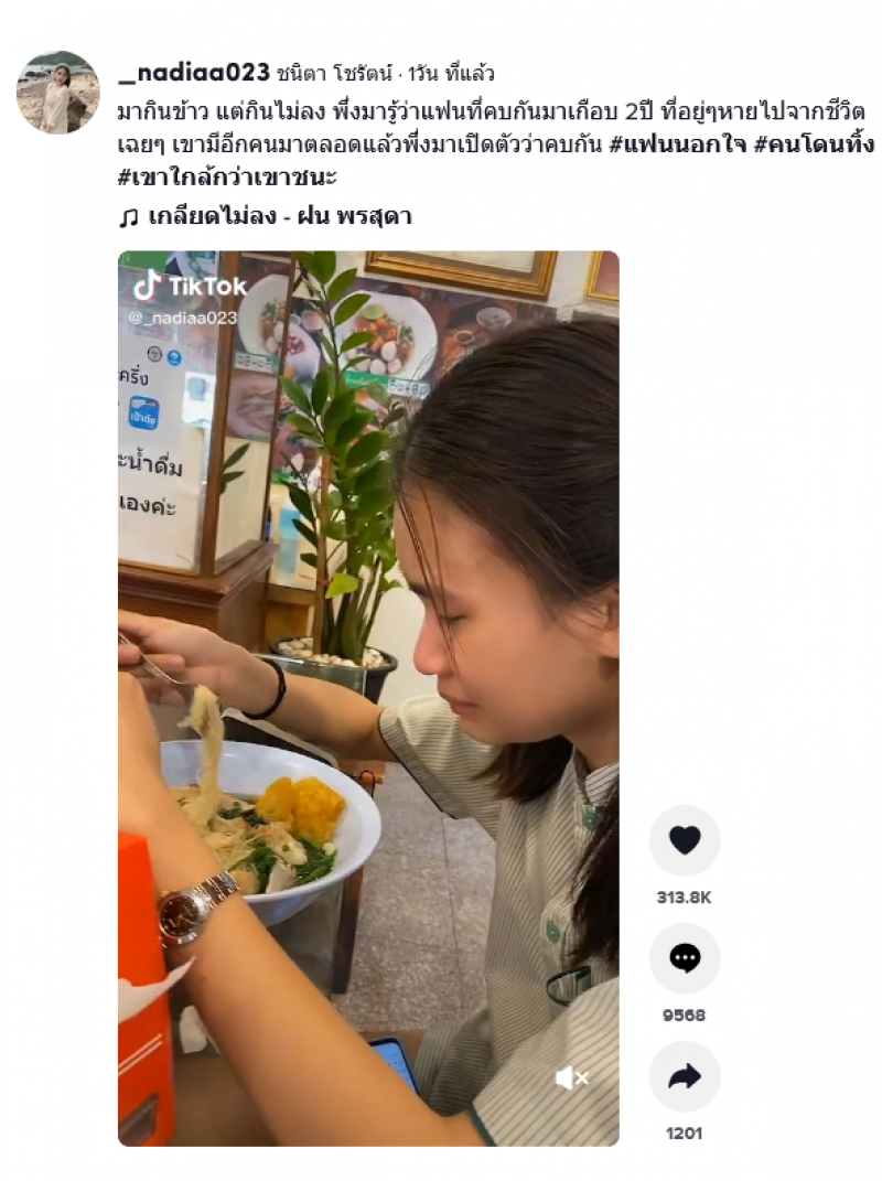 กลายเป็นอีกหนึ่งเรื่องราวที่ได้รับความสนใจเป็นอย่างมากในโลกออนไลน์ หลังจากที่ผู้ใช้ Tiktok ชื่อ _nadiaa023 ได้มีการโพสต์คลิป สาวพนักงานร้านสะดวกซื้อคนหนึ่งกำลังนั่งทานก๋วยเตี๋ยว ด้วยความเศร้าพร้อมกับระบุว่ามากินข้าว แต่กินไม่ลง พึ่งมารู้ว่าแฟนที่คบกันมาเกือบ 2ปี ที่อยู่ๆหายไป จากชีวิตเฉยๆ เขามีอีกคนมาตลอดแล้วพึ่งมาเปิดตัวว่าคบกัน #แฟนนอกใจ #คนโดนทิ้ง #เขาใกล้กว่าเขาชนะ