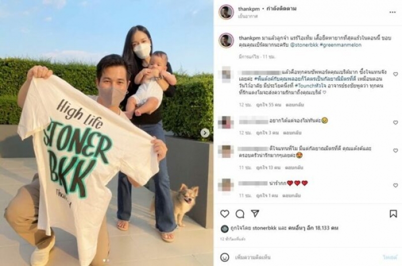 นอกจากนั้นหนุ่มเแต๊งค์ยังได้โพสต์ภาพอยู่กับภรรยาและลูก โดยโชว์เสื้อจากเบิร์ด พร้อมแคปชั่นว่า มาแล้วลูกจ๋า แรร์ไอเท็ม เสื้อยืดหายากที่สุดแร้วในตอนนี้ ขอบคุณคุณเบิร์ดมากนะครับ @stonerbkk #greenmanmelon