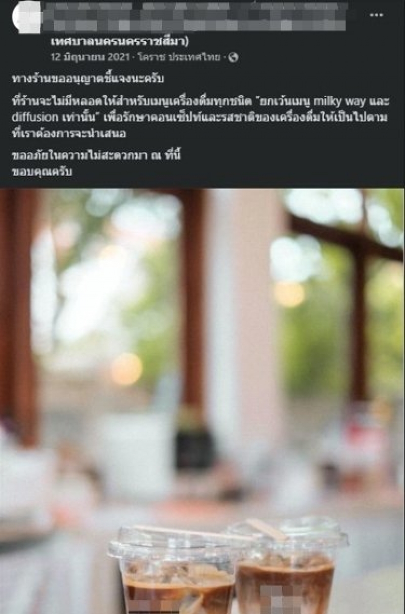 จากกรณีหญิงสาวรายหนึ่งโพสต์ผ่านเฟซบุ๊ก เล่าประสบการณ์การไปร้านคาเฟ่ร้านหนึ่งที่จังหวัดนครราชสีมา โดยเธอสั่งเครื่องดื่มทั้งหมด 3 แก้วได้แก่ โกโก้เย็น, ชาเขียวเย็น และ DirtyCoffee โดยเอากลับบ้านทั้งหมด เมื่อพนักงานชงเครื่องดื่มเสร็จทั้ง 3 แก้วกลับพบว่าเมนูชาเขียวเย็นไม่ได้หลอดมาด้วย เธอจึงไปขอพนักงานเพิ่มแต่ทางพนักงานจึงตอบว่า ให้หลอดไม่ได้เพราะชาเขียวเย็นทางร้านเสิร์ฟเป็นแก้วยกดื่ม และเป็นคอนเซ็ปต์ของร้าน