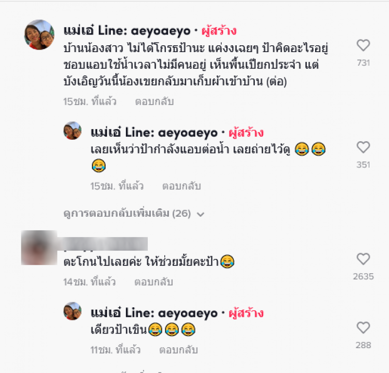 ทั้งนี้ ผู้โพสต์ยังเผยอีกว่า บ้านน้องสาว ไม่ได้โกรธป้านะ แค่งงเฉยๆ ป้าคิดอะไรอยู่ ชอบแอบใช้น้ำเวลาไม่มีคนอยู่ เห็นพื้นเปียกประจำ แต่บังเอิญวันนี้น้องเขยกลับมาเก็บผ้าเข้าบ้าน เลยเห็นว่าป้ากำลังแอบต่อน้ำ เลยถ่ายไว้ดู
