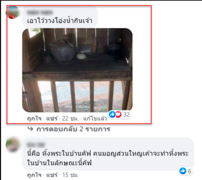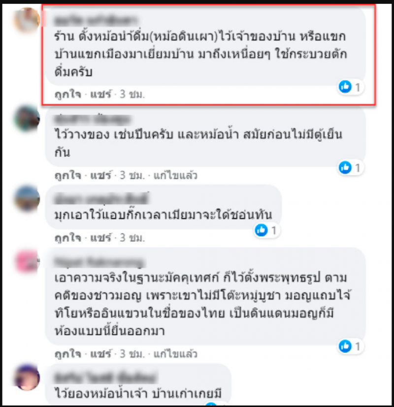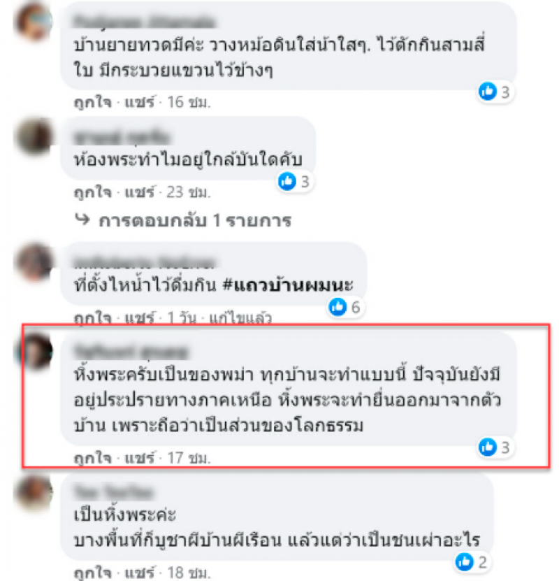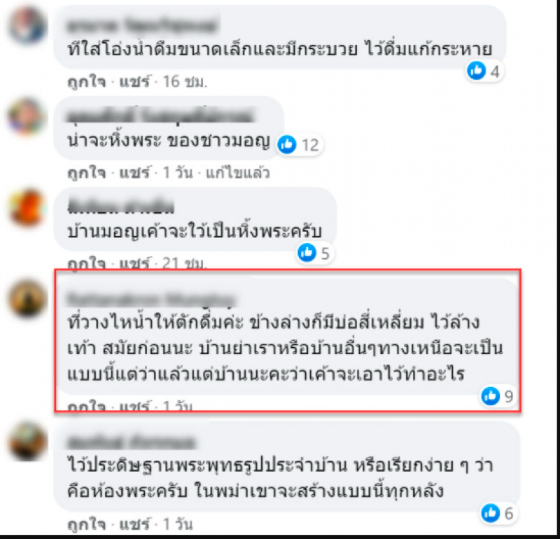 ต่อมามีชาวเน็ตเข้ามาไขข้อสงสัยมากมายเช่น นี่คือที่วางไหน้ำให้ตักดื่ม ข้างล่างก็มีบ่อสี่เหลี่ยม ไว้ล้างเท้าสมัยก่อนนะ บ้านย่าเราหรือบ้านอื่นๆทางเหนือจะเป็นแบบนี้แต่ว่าแล้วแต่บ้านและทุกวันนี้ก็ยังมีอยู่