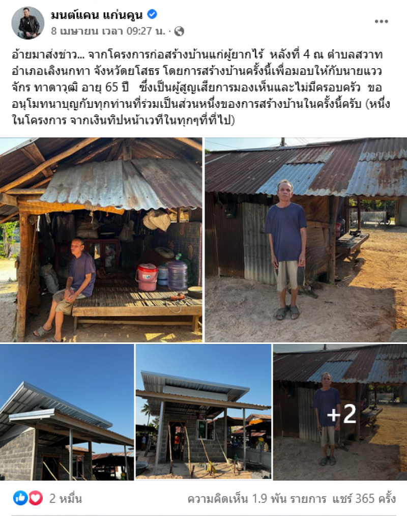 เรียกได้ว่าเป็นอีกหนึ่งเรื่องราวที่น่าชื่นชมเป็นอย่างมาก หลังจากที่นักร้องลูกทุ่งคนดัง มนต์แคน แก่นคูน ขอทำดีคืนแก่สังคม ด้วยการนำเงินทิปหน้าเวที มาสร้างบ้านให้แก่ผู้ยากไร้ โดยเจ้าตัวได้บอกเล่าเรื่องราวผ่านเพจ มนต์แคน แก่นคูน ว่าล่าสุดได้ก่อสร้างบ้านแก่ผู้ยากไร้ ที่ จ.ยโสธร ซึ่งถือว่าเป็นหลังที่ 4 ที่สร้างขึ้นเพื่อช่วยเหลือผู้ที่ยากลำบาก