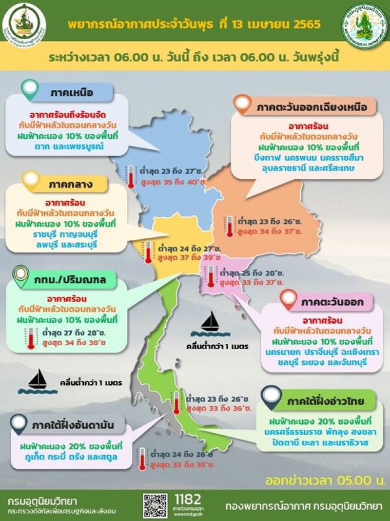 วันที่ 12 เม.ย.2565 กรมอุตุฯ พยากรณ์อากาศ 24 ชั่วโมงข้างหน้า ความกดอากาศต่ำเนื่องจากความร้อนปกคลุมประเทศไทยตอนบน ลักษณะเช่นนี้ทำให้บริเวณประเทศไทยตอนบนมีอากาศร้อนถึงร้อนจัด กับมีฟ้าหลัวในตอนกลางวัน ในขณะที่ลมใต้และลมตะวันออกเฉียงใต้กำลังอ่อนพัดปกคลุมประเทศไทยตอนบน ทำให้บริเวณดังกล่าวมีฝนฟ้าคะนองเกิดขึ้นได้บางพื้นที่