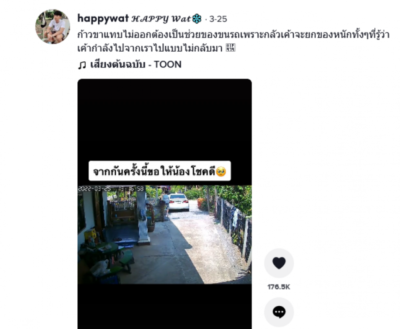 เรียกได้ว่าเป็นอีกหนึ่งเรื่องราวที่ชาวโซเชียลต่างเข้ามาแสดงความคิดเห็นกันเป็นจำนวนมาก หลังได้มีผู้ใช้ tiktok รายหนึ่ง ได้โพสต์คลิปจากกล้องวงจรปิดหน้าบ้าน ได้มาช่วยยกของเอาไปใส่ที่รถให้แฟนครั้งสุดท้าย เพราะกลัวว่าถ้ายกเองมันจะหนัก ซึ่งก็ขอทำให้เองแม้ว่าจะไม่ได้อยากทำเลยก็ได้ โดยได้โพสต์ระบุข้อความว่า ก้าวขาแทบไม่ออกต้องเป็นช่วยของขนรถเพราะกลัวเค้าจะยกของหนักทั้งๆที่รู้ว่าเค้ากำลังไปจากเราไปแบบไม่กลับมา