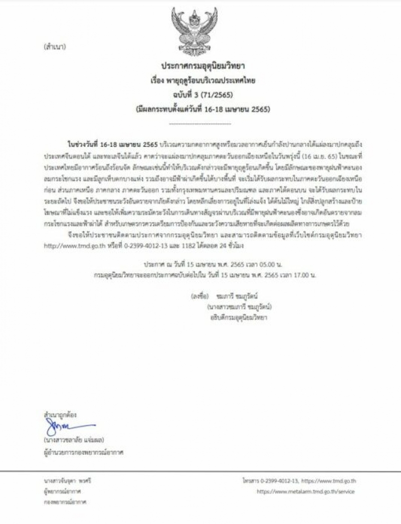 เมื่อเวลา 05.00 น. วันที่ 15 เม.ย.65 น.ส.ชมภารี ชมภูรัตน์ อธิบดีกรมอุตุนิยมวิทยา ออกประกาศกรมอุตุนิยมวิทยาเรื่อง พายุฤดูร้อนบริเวณประเทศไทย (มีผลกระทบตั้งแต่วันที่ 16-18 เมษายน 2565) ฉบับที่ 3 ระบุว่า ในช่วงวันที่ 16-18 เม.ย.65 บริเวณความกดอากาศสูงหรือมวลอากาศเย็นกำลังปานกลางได้แผ่ลงมาปกคลุมถึงประเทศจีนตอนใต้ และทะเลจีนใต้แล้ว คาดว่าจะแผ่ลงมาปกคลุมภาคตะวันออกเฉียงเหนือในวันพรุ่งนี้ (16 เม.ย. 65)