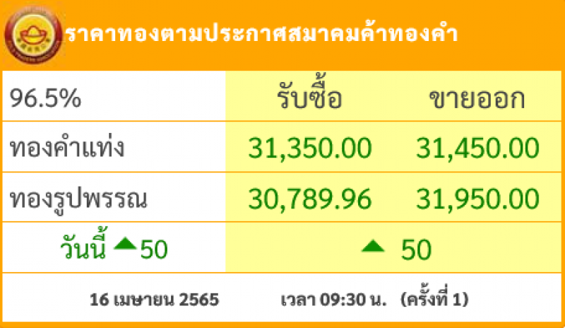 วันที่ 16 เมษายน 2565 สมาคมค้าทองคำรายงาน ราคาทองไทย ครั้งที่ 1 เมื่อเวลา 09:30 น. โดยราคาทองล่าสุดราคานั้น ได้มีการปรับขึ้นมาต่อเนื่องอีก 50 บาท ในวันนี้ ส่งผลทำให้ราคาวันนี้ทองคำ แท่ง รับซื้อบาทละ 31,350 ขายออกบาทละ 31,450 บาท ส่วนทองรูปพรรณ รับซื้อบาทละ 30,789.96 ขายออกบาทละ 31,950 บาท