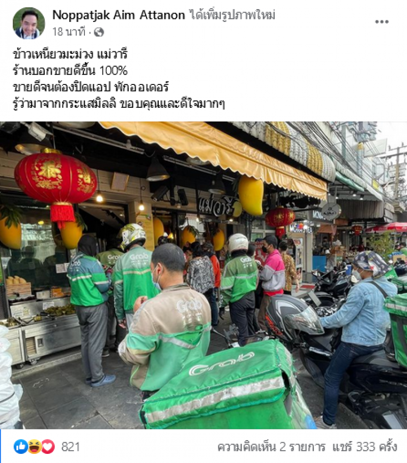 ล่าสุดในโลกออนไลน์ ผู้ใช้เฟซบุ๊กชื่อ Noppatjak Aim Attanon ซึ่งเป็นผู้สื่อข่าว ได้โพสต์ภาพที่ร้านขายข้าวเหนียวมะม่วงแห่งหนึ่ง พร้อมระบุว่า ข้าวเหนียวมะม่วง แม่วารี ร้านบอกขายดีขึ้น 100% ขายดีจนต้องปิดแอป พักออเดอร์ รู้ว่ามาจากกระแสมิลลิ ขอบคุณและดีใจมากๆ