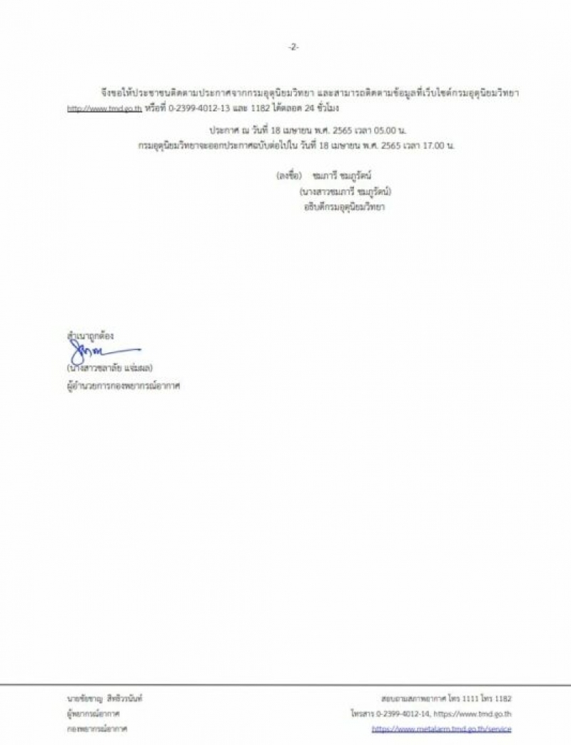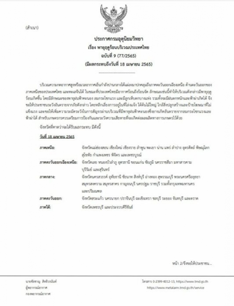 เมื่อวันที่ 18 เม.ย.65 น.ส.ชมภารี ชมภูรัตน์ อธิบดีกรมอุตุนิยมวิทยา ออกประกาศกรมอุตุนิยมวิทยา เรื่อง พายุฤดูร้อนบริเวณประเทศไทย (มีผลกระทบถึงวันที่ 18 เมษายน 2565) ฉบับที่ 9 ลงวันที่ 18 เมษายน 2565 ระบุว่า