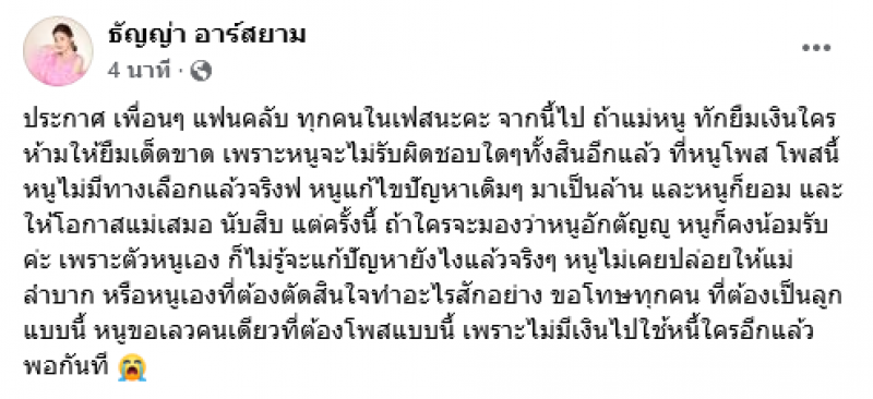 ประกาศ เพื่อนๆ แฟนคลับ ทุกคนในเฟสนะคะ จากนี้ไป ถ้าแม่หนู ทักยืมเงินใคร ห้ามให้ยืมเด็ดขาด เพราะหนูจะไม่รับผิดชอบใดๆทั้งสินอีกแล้ว ที่หนูโพส โพสนี้ หนูไม่มีทางเลือกแล้วจริงฟ หนูแก้ไขปัญหาเดิมๆ มาเป็นล้าน และหนูก็ยอม และให้โอกาสแม่เสมอ นับสิบ แต่ครั้งนี้ ถ้าใครจะมองว่าหนู อักตัญญู หนูก็คงน้อมรับค่ะ เพราะตัวหนูเอง ก็ไม่รู้จะแก้ปัญหายังไงแล้วจริงๆ หนูไม่เคยปล่อยให้แม่ลำบาก หรือหนูเองที่ต้องตัดสินใจทำอะไรสักอย่าง ขอโทษทุกคน ที่ต้องเป็นลูกแบบนี้ หนูขอ...คนเดียวที่ต้องโพสแบบนี้ เพราะไม่มีเงินไปใช้หนี้ใครอีกแล้ว พอกันที