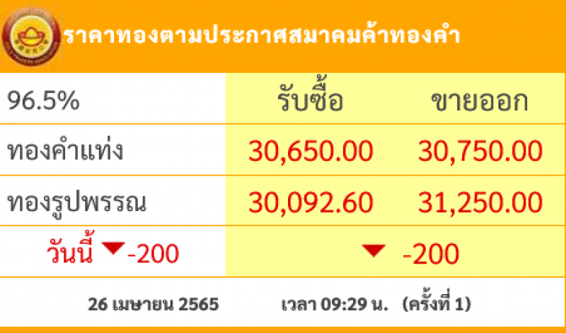 วันที่ 26 เมษายน 2565 สมาคมค้าทองคำรายงาน ราคาทองไทย ครั้งที่ 1 เมื่อเวลา 09:29 น. โดยราคาทองล่าสุดราคานั้น ได้มีการปรับลงมา 200 บาท ในวันนี้ ส่งผลทำให้ราคาวันนี้ทองคำ แท่ง รับซื้อบาทละ 30,650 ขายออกบาทละ 30,750 บาท ส่วนทองรูปพรรณ รับซื้อบาทละ 30,092.60 ขายออกบาทละ 31,250 บาท
