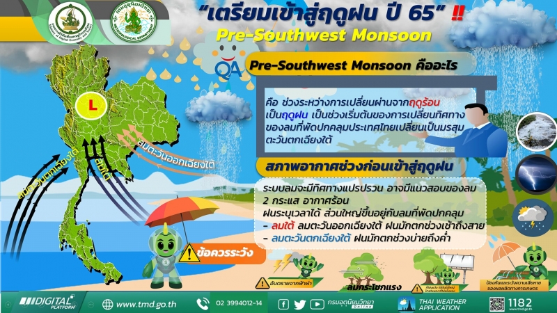 โดย การเตรียมเข้าสู่ฤดูฝน ปี 2565 หรือ Pre-Southwest Monsoon คือ ช่วงระหว่างการเปลี่ยนผ่านจากฤดูร้อนเป็นฤดูฝน เป็นช่วงเริ่มต้นของการเปลี่ยนทิศทางของลมที่พัดปกคลุมประเทศไทย เปลี่ยนเป็นมรสุมตะวันตกเฉียงใต้
