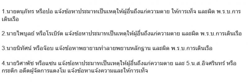 รายงานแจ้งว่า ผู้ต้องหาแต่ละรายจะถูกดำเนินคดีในข้อหา ดังนี้
