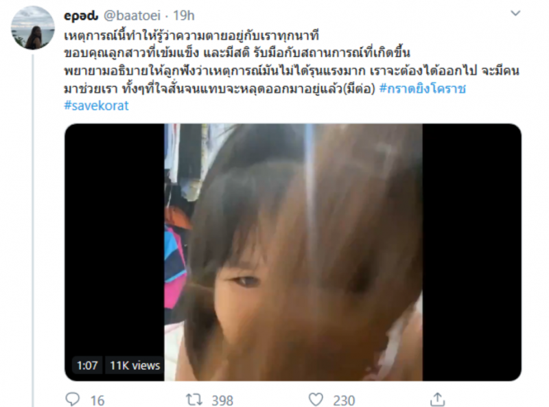 จากกรณีความวุ่นวายที่เกิดขึ้นที่จังหวัดนครราชสีมา ในห้างเทอร์มินอล 21 ล่าสุด ทวิตเตอร์ @baatoei โพสต์คลิปพร้อมข้อความระบุว่า เหตุการณ์นี้ทำให้รู้ว่า อยู่กับเราทุกนาทีขอบคุณบุตรสาวที่เข้มแข็ง และมีสติ รับมือกับสถานการณ์ที่เกิดขึ้น พยายามอธิบายให้บุตรฟังว่าเหตุการณ์มันไม่ได้แย่มาก เราจะต้องได้ออกไป จะมีคนมาช่วยเรา ทั้งๆที่แทบจะไม่ไหวแล้ว