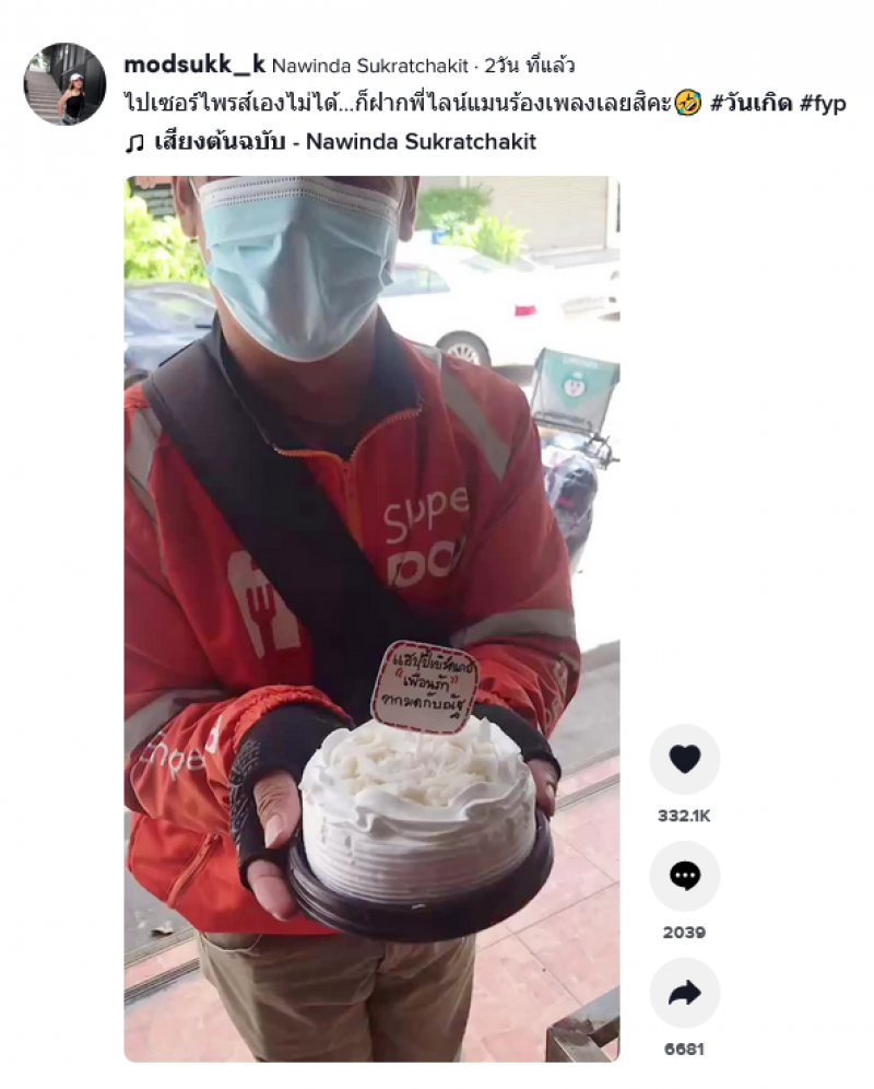 กลายเป็นอีกเรื่องราวน่ารักๆ ที่สร้างความฮือฮาในโลกออนไลน์ หลังจากที่ผู้ใช้ Tiktok ชื่อ modsukk_k โพสต์คลิปเรื่องราวสุดน่ารัก เมื่ออยากเซอร์ไพรส์วันเกิดเพื่อน แต่ไปด้วยตัวเองไม่ได้ งั้นก็สั่งเค้กจากร้านก่อนจะวานให้พี่ไรเดอร์ช่วยร้องเพลงวันเกิดให้ซะเลย งานนี้น่ารักทั้งคนสั่ง ทั้งคนร้องเพลงเลยทีเดียว