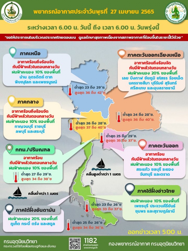 วันที่ 27 เม.ย.65 กรมอุตุนิยมวิทยา รายงาน พยากรณ์อากาศ 24 ชั่วโมงข้างหน้า ความกดอากาศต่ำเนื่องจากความร้อนปกคลุมประเทศไทยตอนบน ลักษณะเช่นนี้ทำให้บริเวณดังกล่าวมีอากาศร้อนโดยทั่วไปกับมีฟ้าหลัวในตอนกลางวัน และมีอากาศร้อนจัดบางพื้นที่ในภาคเหนือ ภาคตะวันออกเฉียงเหนือ และภาคกลาง ขอให้ประชาชนดูแลสุขภาพเนื่องจากอากาศที่ร้อนขึ้นในระยะนี้ไว้ด้วย