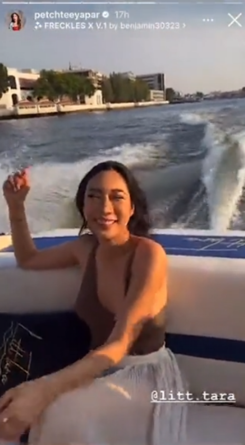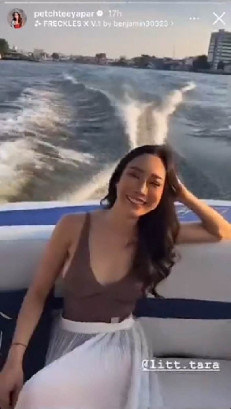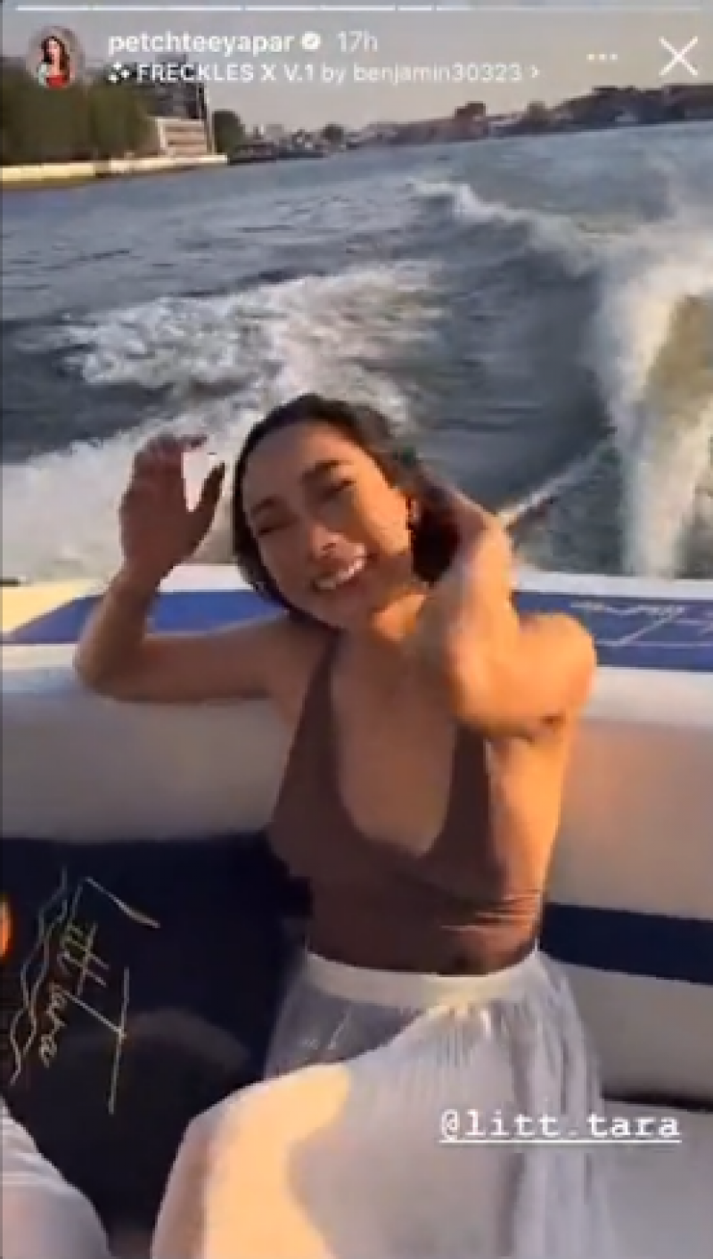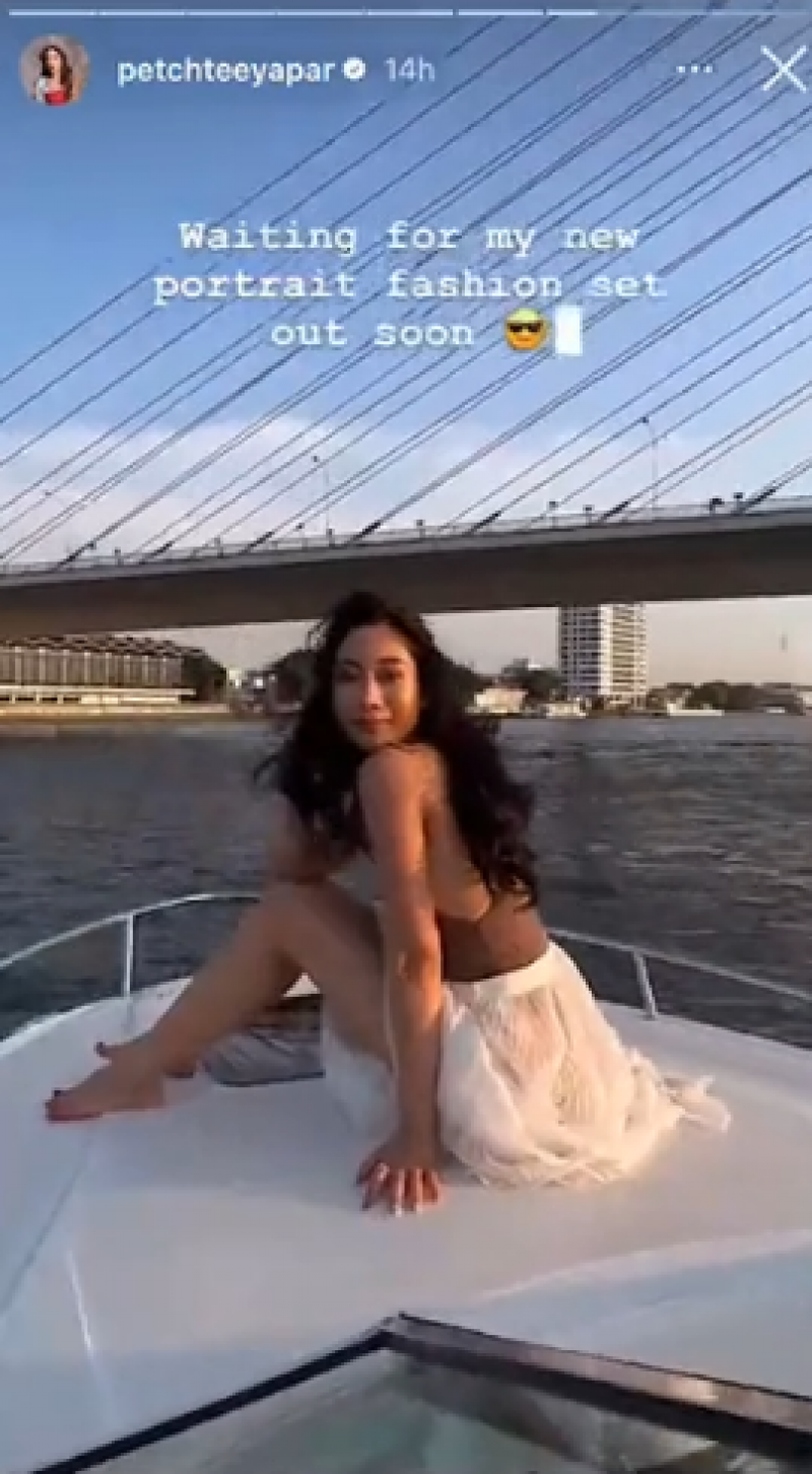 โดยกำลังนั่งอยู่บนเรือสปีดโบ๊ตล่องในแม่น้ำเจ้าพระยา ผ่านสะพานพระราม8 พร้อมทั้งโพสต์ท่าเซ็กซี่ถ่ายแบบเซ็กซี่ พร้อมข้อความเป็นภาษาอังกฤษด้วยว่า Waiting for my new portrait fashion set out soon